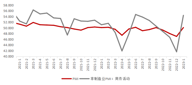 1月PMI指数终止了连续连个月的回落,大幅度回暖到线上。制造业PMI为50.1%,前值为47.0%;非制造业PMI为54.4%,前值为41.6%。