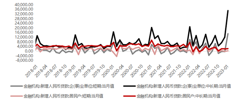 企业信贷“一枝独秀”,居民信贷需求依旧偏弱。信贷方面,1月新增人民币贷款49,000亿元,同比多增9,200亿元,创单月最高纪录,成为本月社融的贡献主力。分部门看,居民信贷需求依旧萎靡,购房意愿不高,住房信贷需求偏弱。短期居民户贷款本月新增341亿元,环比上月显著改善,但同比去年差额-665亿元,指向消费还需进一步修复。企业端信贷增量显著,占新增人民币贷款比例高达94%。其中短期企事业贷款同比多增5,000亿元;长期企事业贷款同比多增14,000亿元;票据融资则同比减少5,915亿元,可能源于企业的融资替代。“稳增长”背景下一揽子稳经济政策的落地生效,对企业的提振作用较大,企业预期得到改善,投资性的中长期贷款显著增加;同时,疫情放开后的需求回暖也起到了刺激作用,结合PMI来看,非国有制造业和服务业复工复产形势较好,使企业的短期融资需求也有所上升。