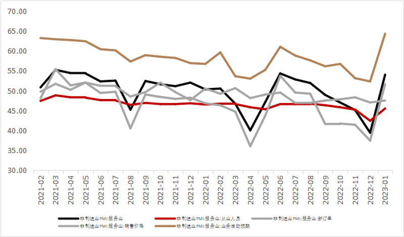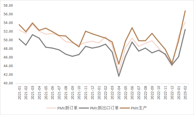 生产需求延续显著修复,分别较上月回升3.2和6.9个百分点,至54.1%和56.7%。在节日的掣肘消退之后,生产端大幅回升,同时也表明1月生产端修复偏慢,并非三年疫情期间部分市场主体退出、市场结构变化所致。
