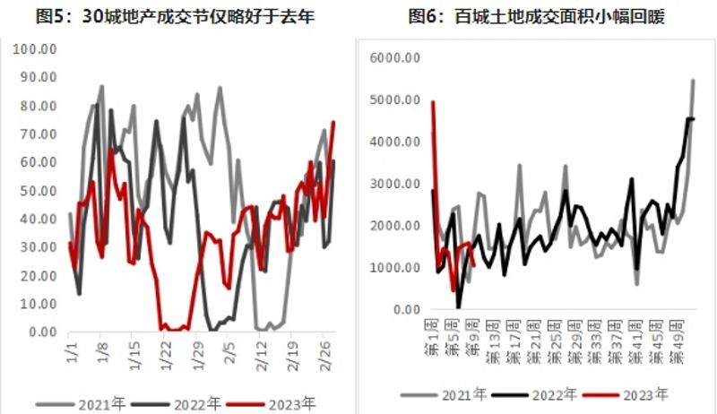 2月,地产市场活跃度有较为明显回升,但区域分化较为显著,从30城成交面积看,仅略优于去年同期,与2021年同期水平相当,但北京、杭州、成都等重点城市交易活跃度提升明显,地产交易整体为核心城市带动。土地交易面也较为类似,成交规模有小幅回暖,但为主要城市带动,区域分化较为显著,重点城市土地溢价明显,非核心区域/城市城投托底仍然显著,房企逐步向核心城市涌入。