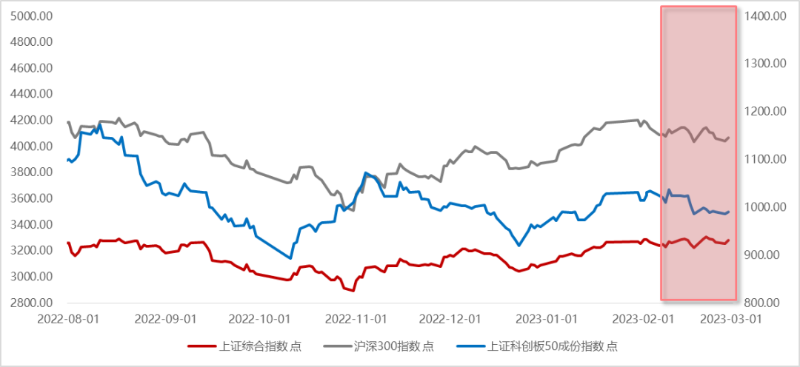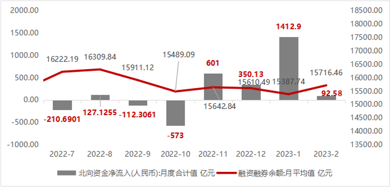 A股在2月走出震荡行情,数据真空期叠加外资回落加速板块轮动,外部压力导致上行放缓。2月上证综指3262点开局后一路震荡,报收3279点。中美经济错位拉大、美联储加息再起,人民币汇率调整和数据真空期下的主线缺失,拖累外资减速,而内资接棒;2月两融和基金发力,分别净流入638亿元和328亿元,均大幅超出1月。2023年2月北向资金流入大幅减少至93亿元,较上月大幅下滑。