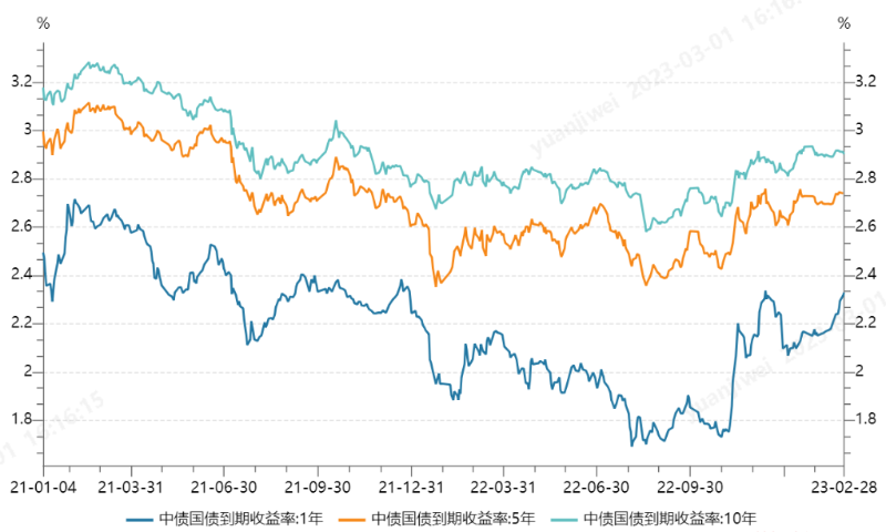 回顾2月,央行小幅回笼流动性1410亿元,资金面仍偏紧,隔夜SHIBOR平均为1.88%,较上月上升53bp;一周SHIBOR平均为2.09%,升高7bp,货币市场利率中枢已回升到2022年初的水平。同业存单收益率也跟随上升,以股份制银行为例,1年期同业存单收益率上升13bp,6月期同业存单收益率上升14bp。10年期国债收益率呈现窄幅波动,围绕2.9%左右波动,市场进一步等待宏观数据和政策导向;相比中长期利率横盘走势,短期国债收益率追随货币市场利率继续上升,2月升高18bp。