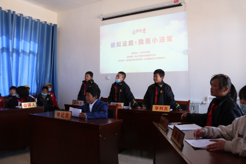 旋马滩村位于榆中县城南43公里的二阴山区,属典型的高寒阴湿山区,平均海拔2710米,全村辖3个村民小组,有农业人口222户935人,留守儿童50余人。启动仪式为每名留守儿童发放了装有水杯、雨伞、文具、饭盒等学习用具和生活用品的温暖包。在专业律师的组织下,留守儿童开展“模拟法庭”体验活动,以校园霸凌事件为蓝本,引导10名儿童分别扮演审判长、书记员、公诉人、辩护人、被告人等角色,从宣读法庭纪律、押解被告人到庭,到公诉人宣读起诉书、辩护人进行辩护、被告人忏悔……大家沉浸式体验了法庭审理案件的流程,增进了儿童对我国公诉审判制度的认识和了解、同时帮助儿童树立正确的三观,增强遵纪守法的意识,提高自我保护的能力。